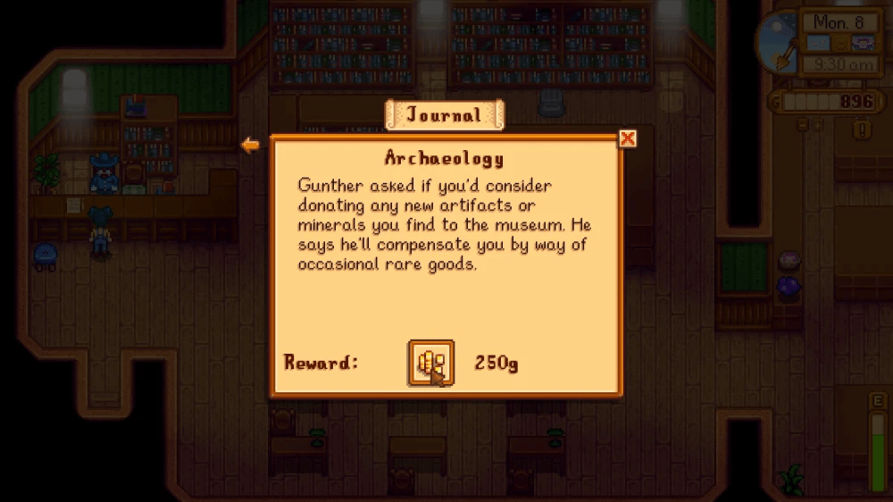 The game quickly introduces Archaeology into the game by having an “Archaeology” quest that can be triggered early in the game – the player just has to enter the museum with an artefact or mineral in their inventory. The quest involves the player finding an artefact or mineral and then donating it to the museum, which is quite easily achieved.