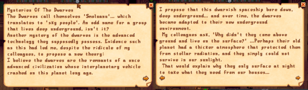 One of the main artefacts of the Dwarvish culture that the player can discover are the four Dwarvish Scrolls. Upon completing this set, the player gains the ability to understand the dwarvish language and is then able to communicate with the Dwarf who lives in the mines. The Dwarf is wary of humans and the shadow people as referenced through conversation. When the player reaches 6 hearts of friendship level with the Dwarf they state: “Long ago, my people knew the secrets of advanced technology. The archaeological evidence proves that. But I wonder where it came from? And where did it all go? I guess some questions will never be answered…”