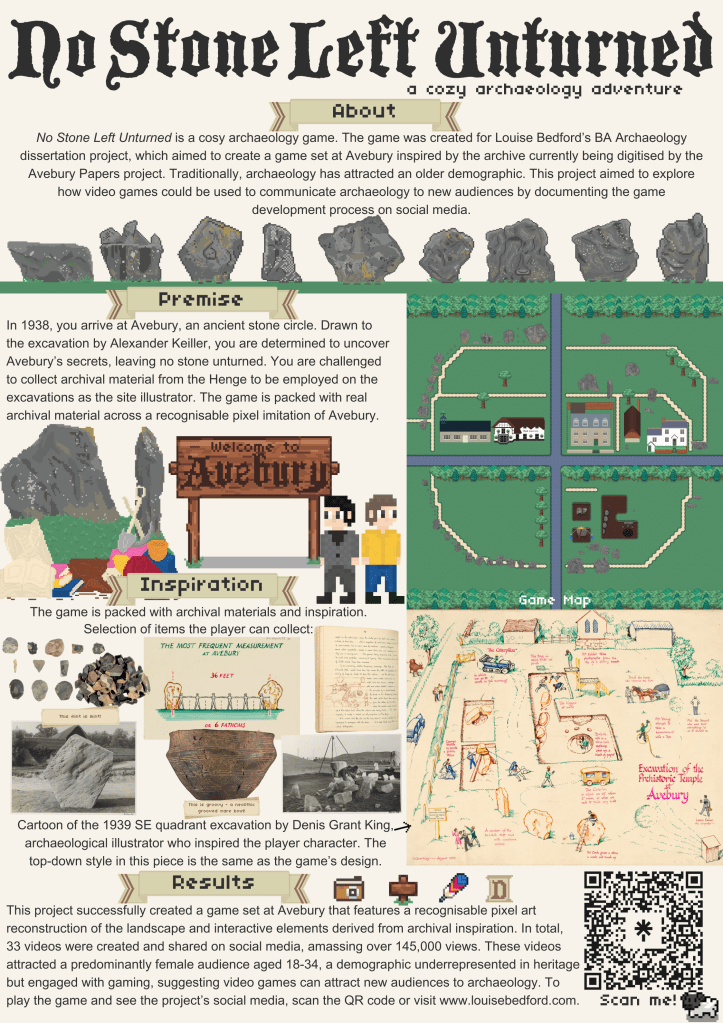 Traditionally, archaeology has attracted an older demographic. Video games and social media provide an opportunity to communicate archaeology to new audiences. This project for my undergraduate dissertation aimed to create a game set at Avebury Henge, inspired by the archive currently being digitised by the Avebury Papers project, and to document the process on social media.